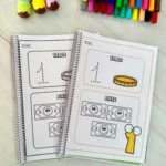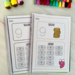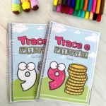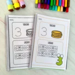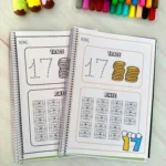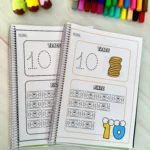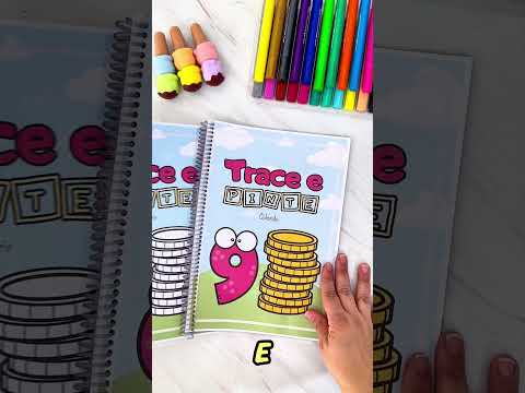 A criança traça o número pontilhado e depois pinta a quantidade correspondente, unindo alfabetização numérica e coordenação motora.