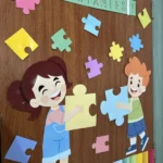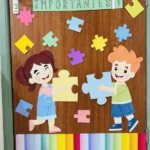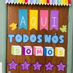 Um painel de porta lindo e significativo para trabalhar acolhimento, pertencimento e respeito: “Aqui todos nós somos peças importantes!” com tema quebra-cabeça, lápis coloridos