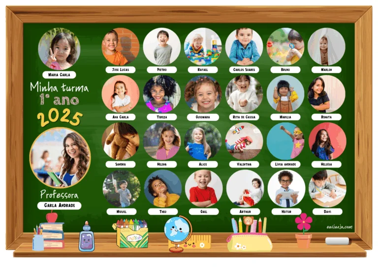 Modelo editável no Canva para montar a Foto da Turma 2025: você abre o link, envia as fotos, substitui os espaços do layout e baixa em PDF/PNG/JPG para imprimir ou enviar no digital. Acompanha orientações passo a passo para editar com facilidade.